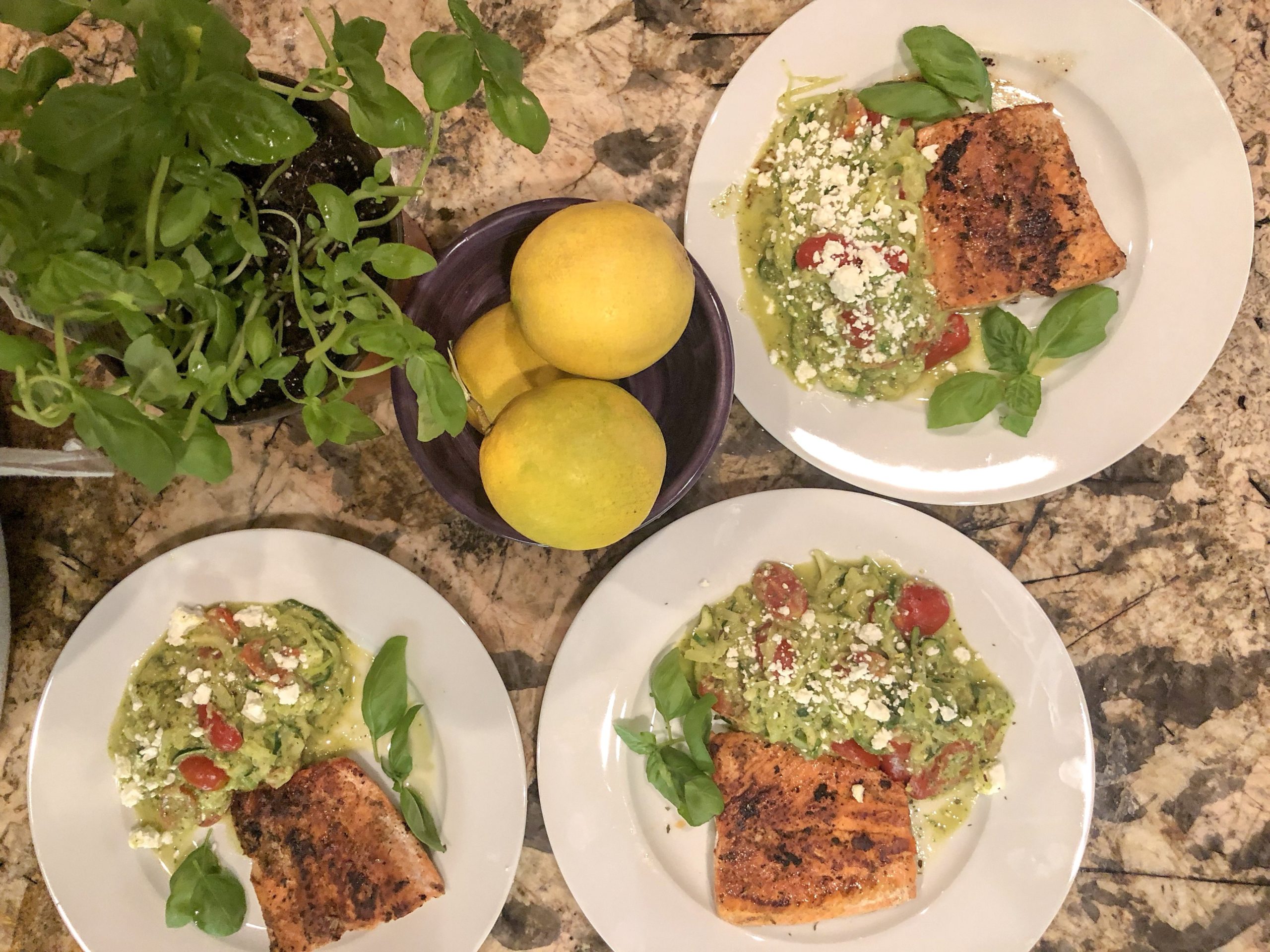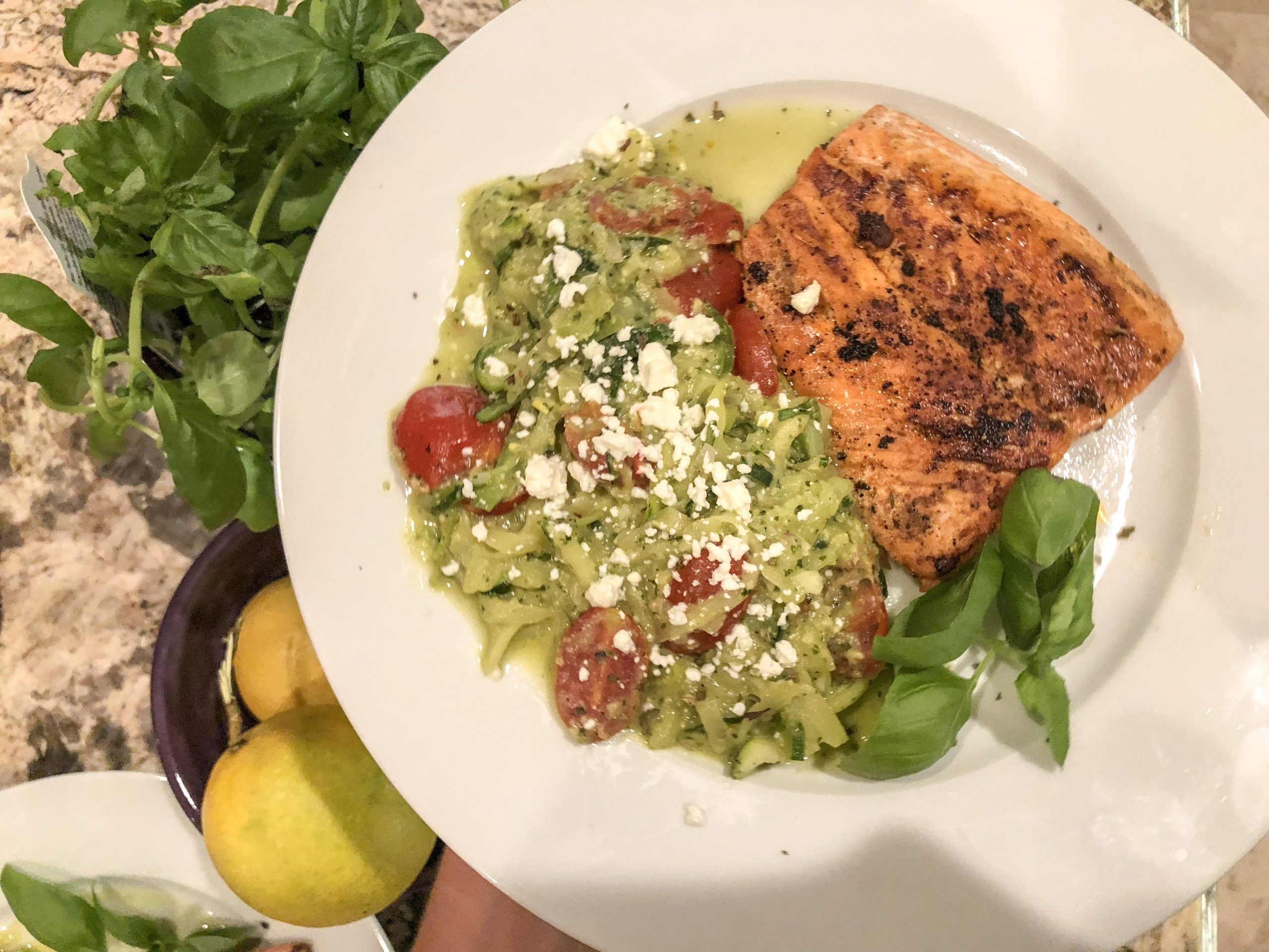 First of all, zucchini noodles ae in my diet pretty much weekly, without fail. That being said, I’m always looking for different ways to serve and flavor them. This week, I decided to try out a pesto version and it turned out SO WELL! I’m really excited to share this with you all, as it was amazingly easy too. Literally two dishes and easy clean up makes for a happy me (or Nick, ha!)