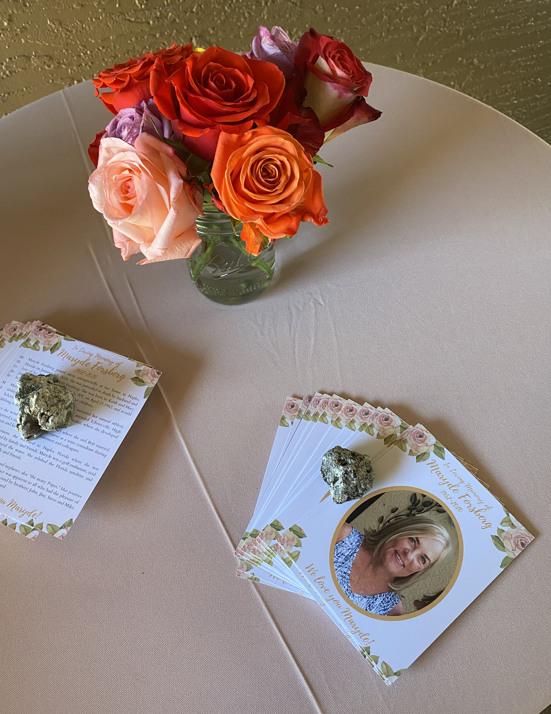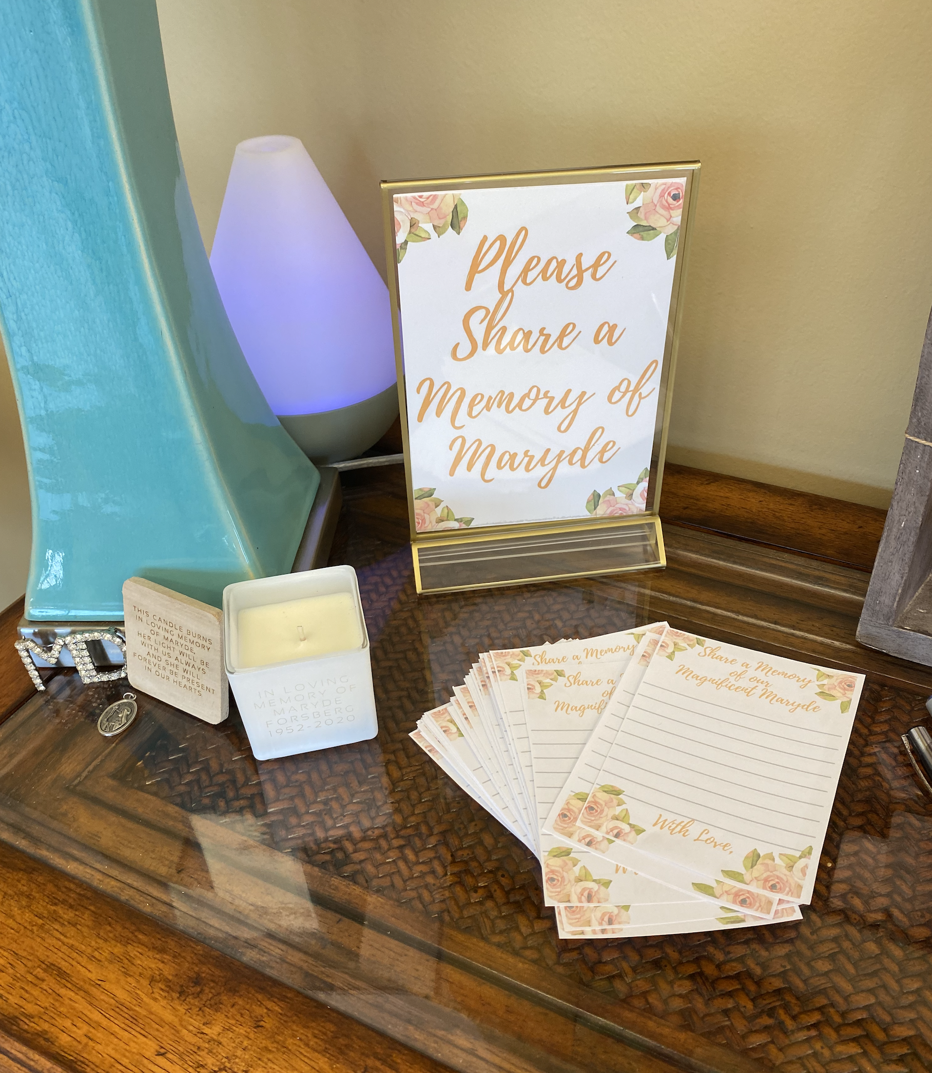 - Mary De’s Memorial Cards with her obituary for everyone to take.