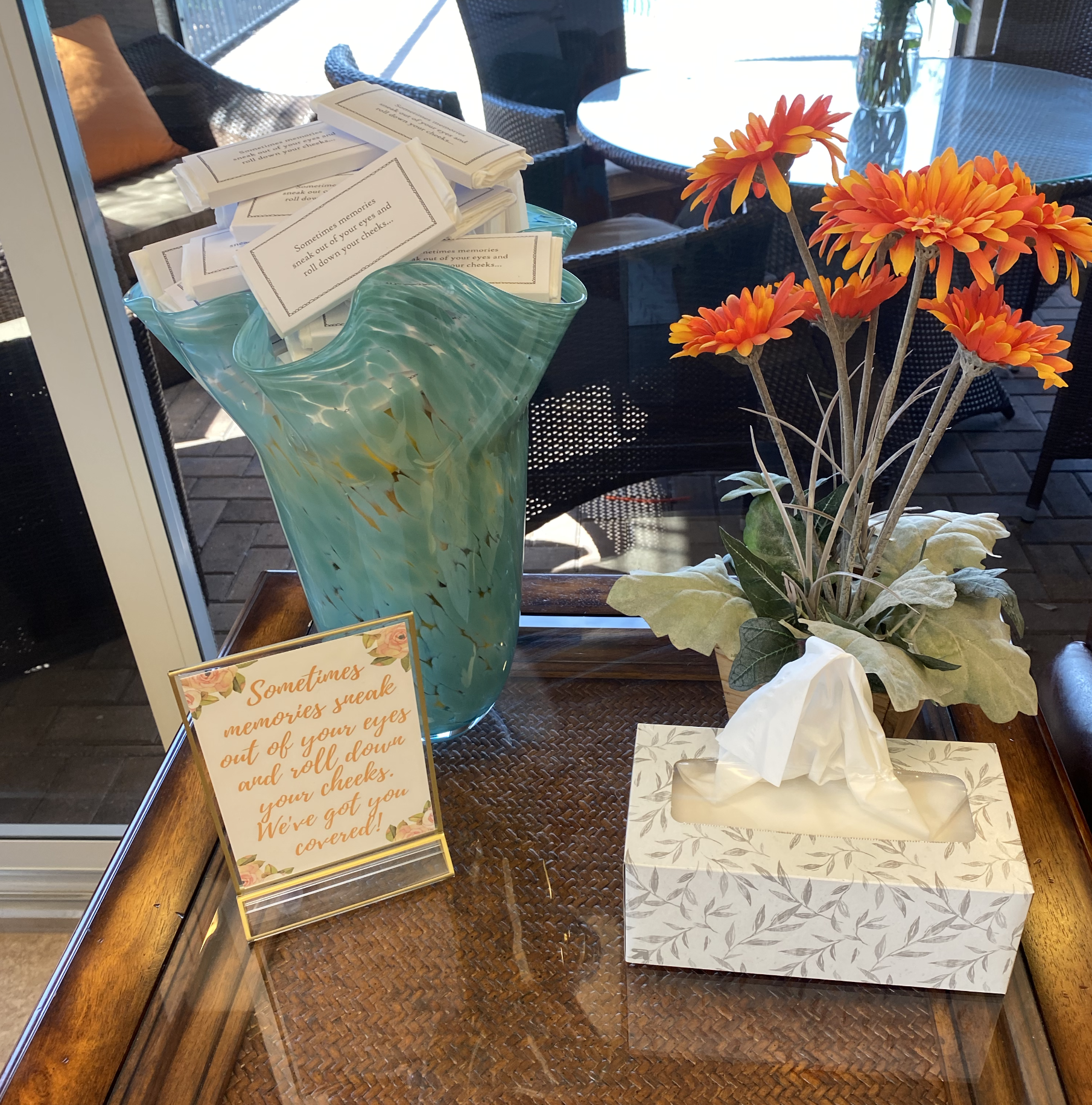 - We called tears ‘memories’ and had mini packs of tissues available for everyone.