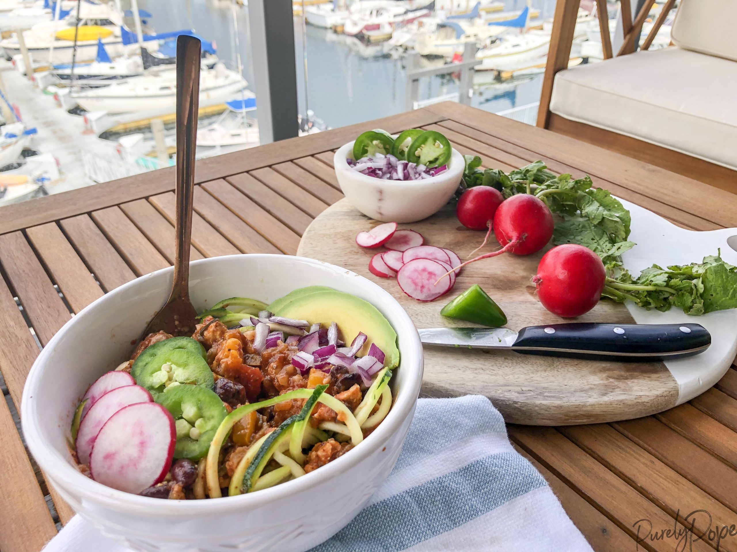 I love prepping this on a Sunday and having ready for lunches throughout the week. It’s the perfect fall staple. Before we jump in, here is a list of the specific products I prefer to use for the recipe: Muir Glen Fire Roasted Crushed Tomatoes, Bare Bone’s Chicken Bone Broth and Simple Truth Organic Ground Flax Seed Meal.