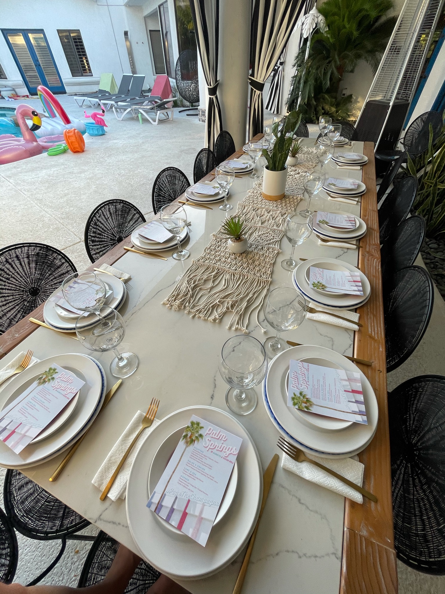 Now that that is out of the way, let’s start with the LOCATION! We chose Palm Springs. It’s an amazing town, has great (hot!) weather (best times to go are March – May IMO), good restaurants, fun bars (Hunter’s is our JAM) and so many amazing houses to choose from. We got this INSANE airbnb and we loved every second of it. It used to be a boutique hotel, so it worked perfectly.