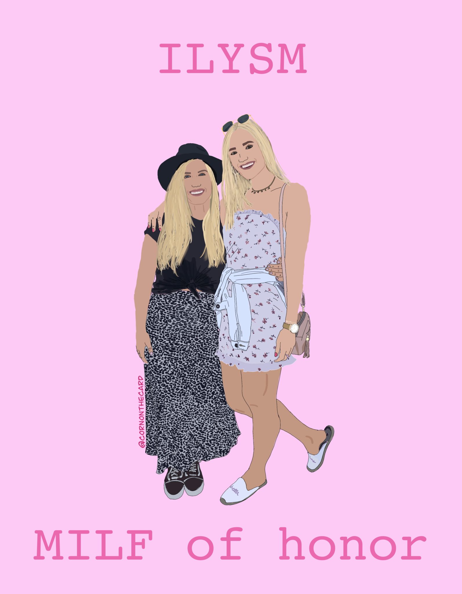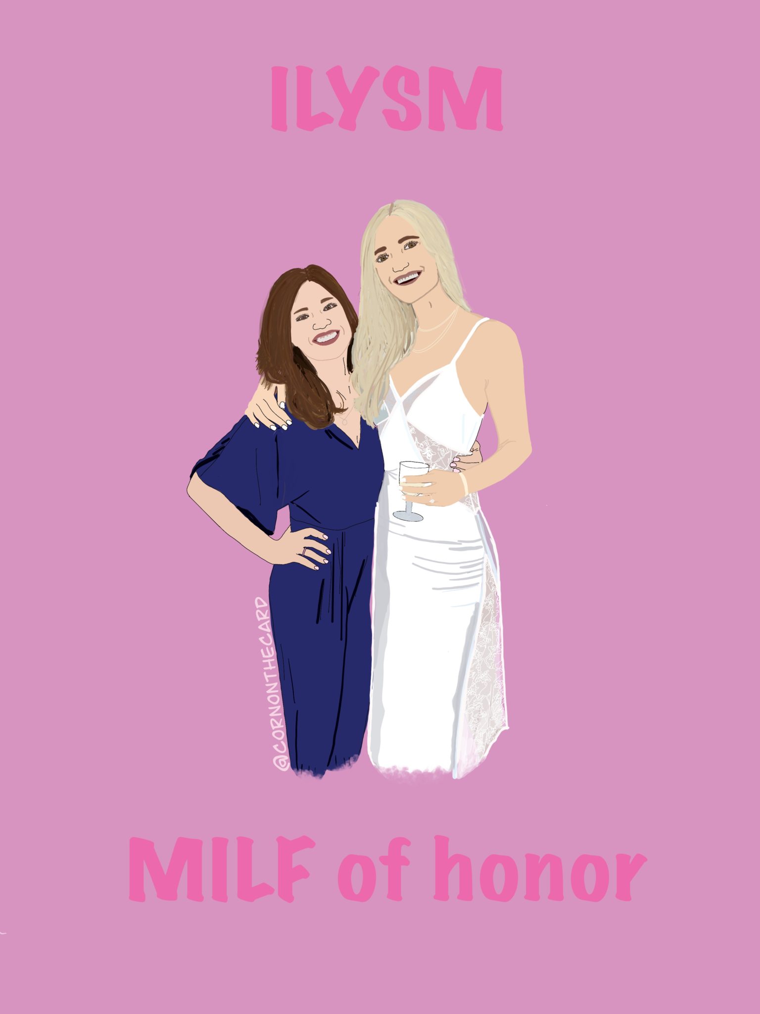 • For my MOH’s, I wanted to do something a little extra, so I had my friend Olivia from Corn on the Card create custom illustrations that I both framed and made into custom cards as well. They loved them!
