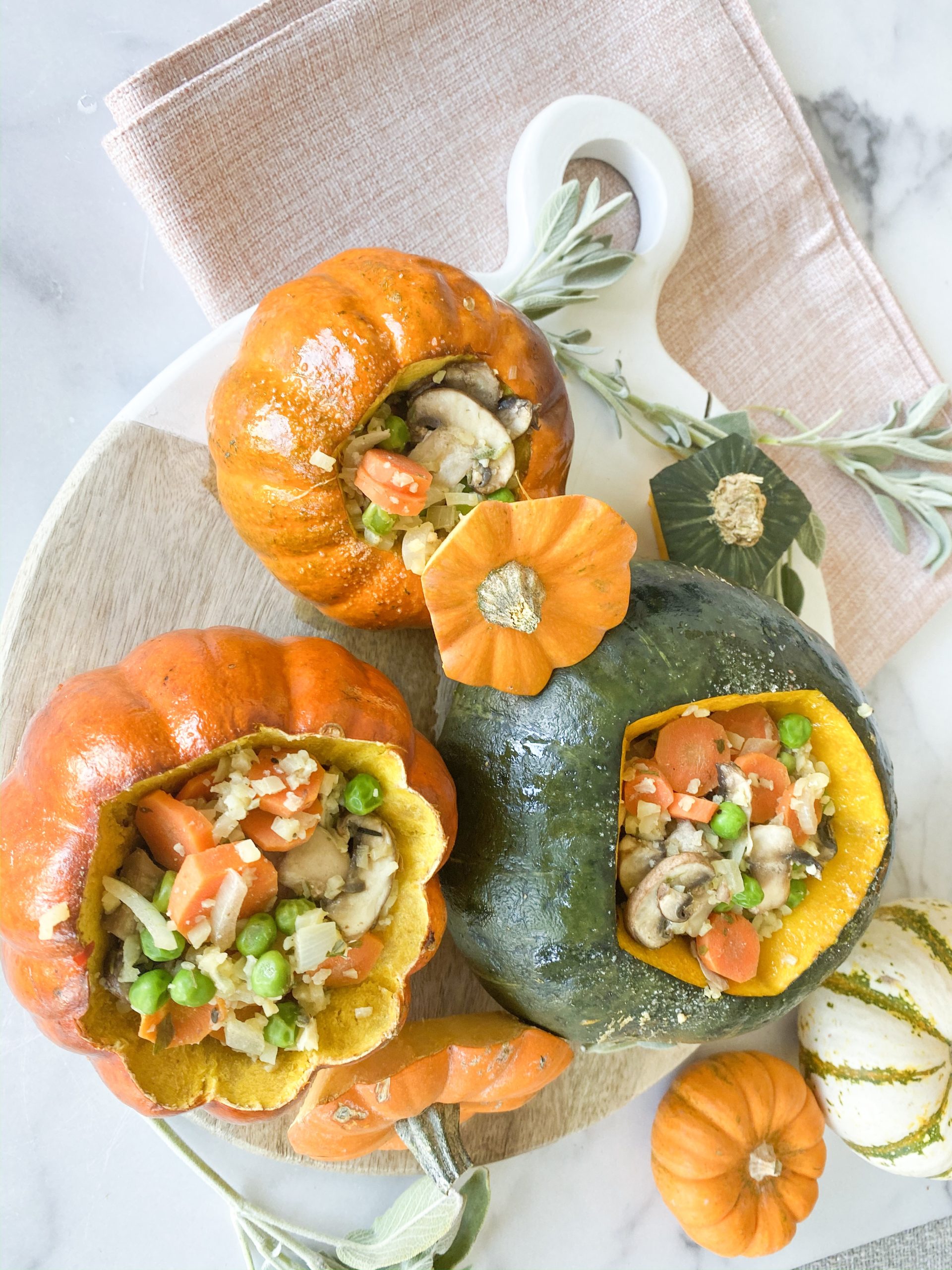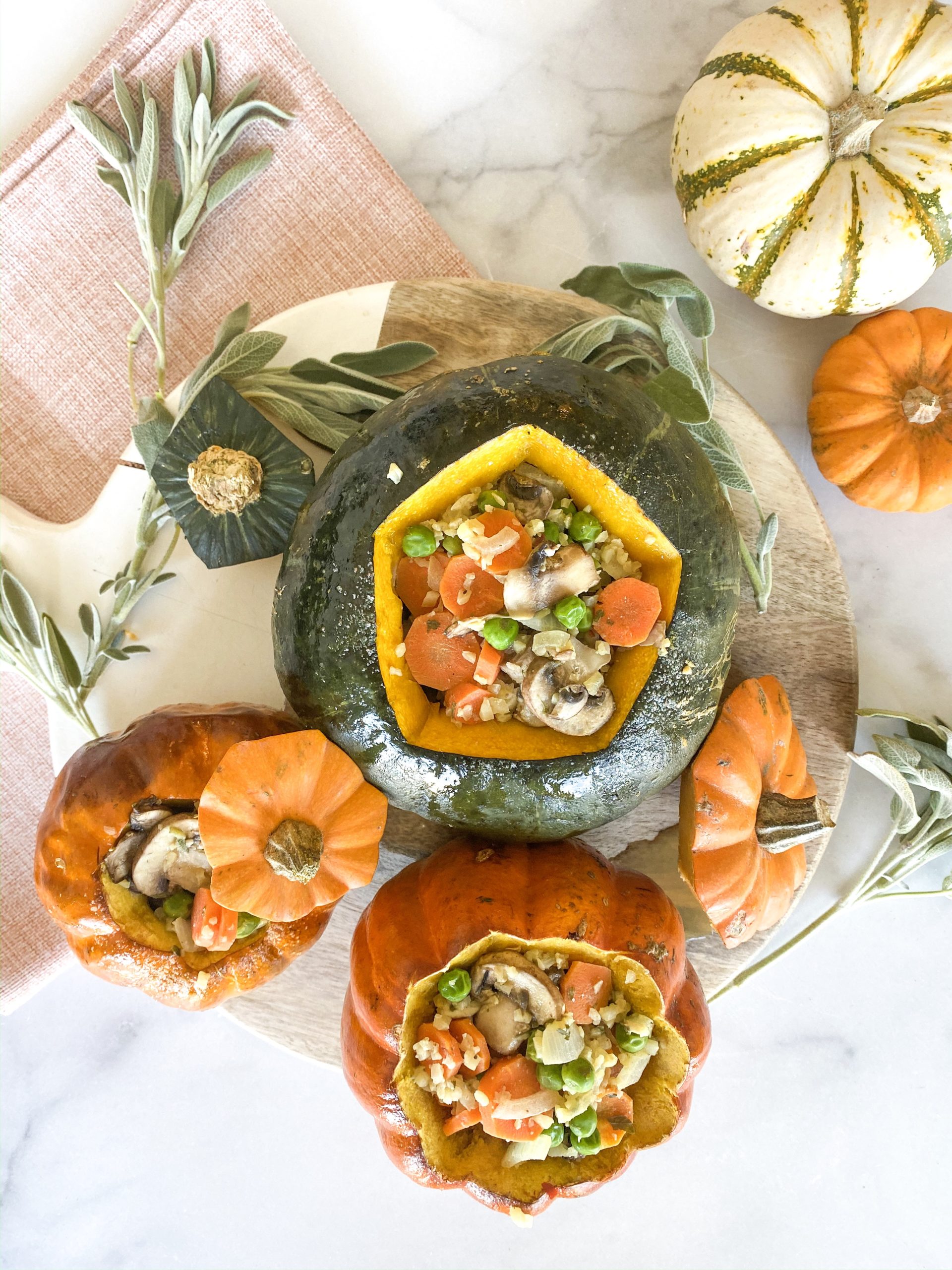 As I was brainstorming what Thanksgiving recipes I would make this year, I had to really get creative considering I’m not eating animal protein (outside of eggs and fish)! Something that popped to mind was a hearty, Thanksgiving Cauliflower Stuffed Squash Recipe. I’ve been a huge proponent of squash this fall season and I’ve been LOVING it.