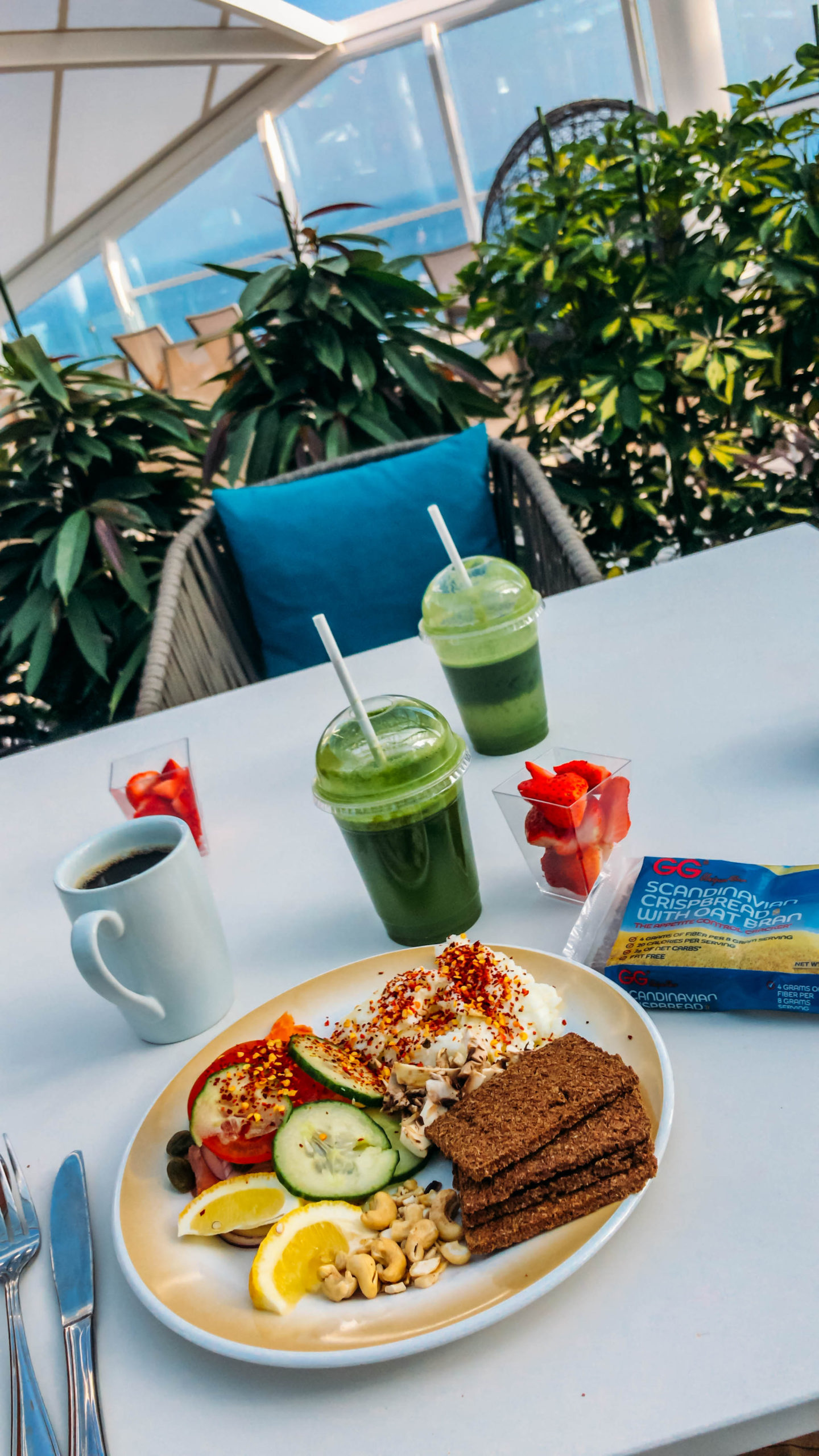 - Since you don’t have access to a blender while on the cruise, I came prepared with my trusty Gluten Free GG Crackers. Each morning, I would pair these with hard boiled eggs, scrambled egg whites or smoked salmon for protein. You could also see if the place you’re staying has a sprouted grain bread, which I also love. I would then add raw veggies such as peppers and mushrooms, for additional fiber and some fresh fruit. For a healthy fat, I would add one of my Artisana Organics Almond Butter Packets or add some avocado. I also had a Vital Proteins Beauty Water packet in my water and coffee of course each morning for extra protein and to keep me looking refreshed throughout vacation.